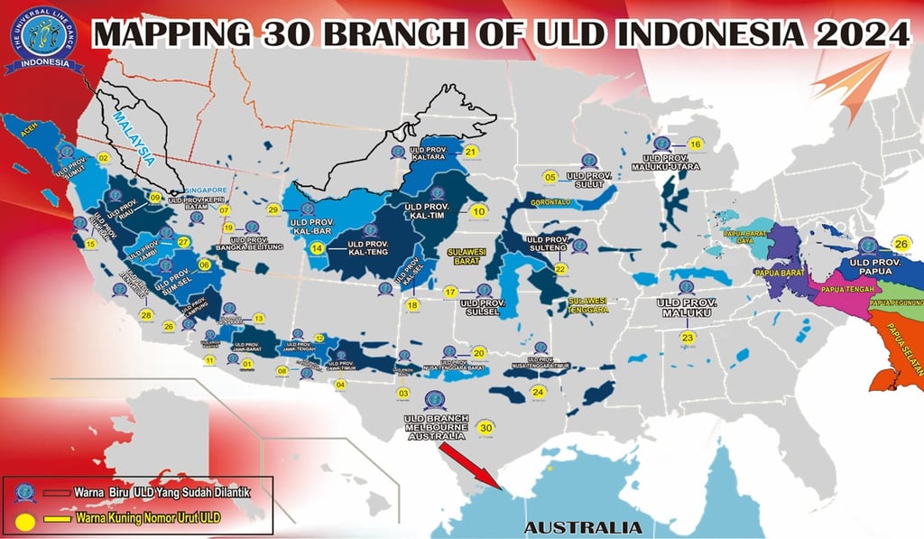 Hingga tahun 2025 The Universal Line Dance Indonesia telah membentuk sebanyak 29 ( dua puluh sembilan ) Kepengurusan d’ULD tingkat Provinsi di Indonesia, serta memiliki sebanyak 120 Cabang di Kabupaten dan Kota dengan total anggota yang terdaftar sebanyak 11.600 ( sebelas ribu enam ratus ) anggota dan tenaga Pengajar atau Instruktur 1.200 orang di seluruh Indonesia,